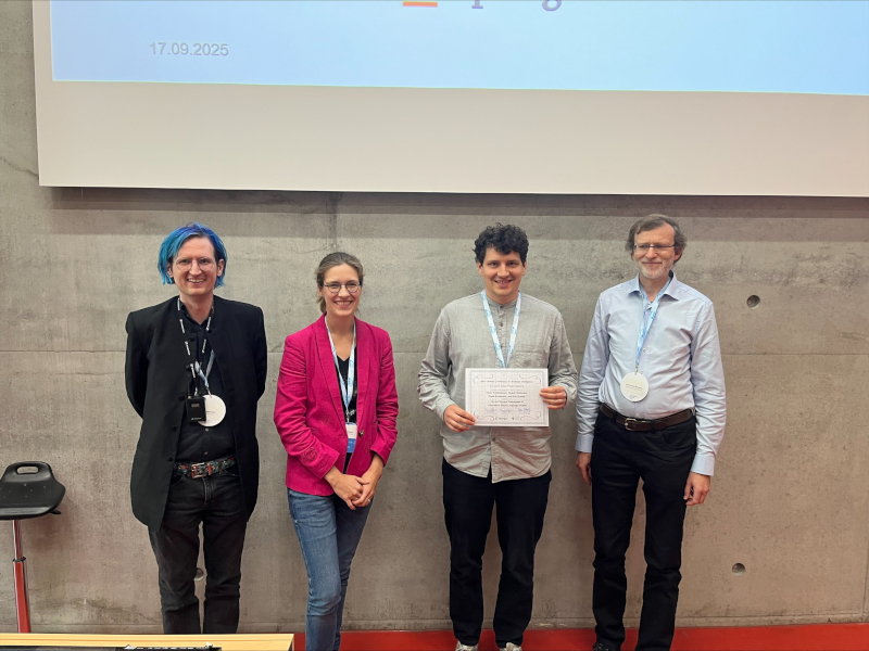 Auf dem Foto sind von links nach rechts die Program Chairs der KI2025, Jun.-Prof. Dr. Benjamin Paaßen (Universität Bielefeld), Jun.-Prof. Dr. Tanya Braun (Universität Münster), sowie Mario Koddenbrock (HTW Berlin, KI-Werkstatt) als einer der ausgezeichneten Autor:innen und Prof. Dr. Frieder Stolzenburg (Hochschule Harz) zu sehen.